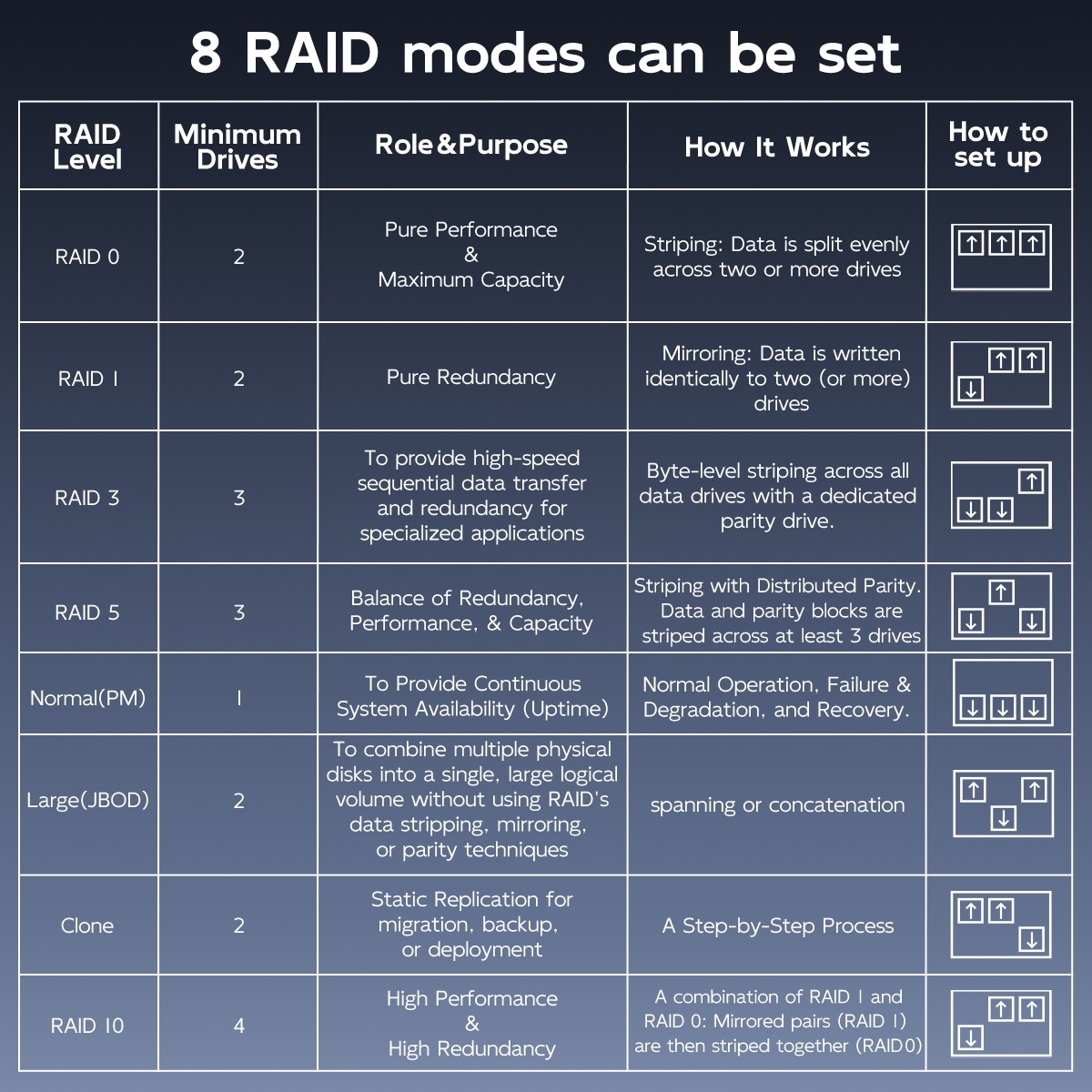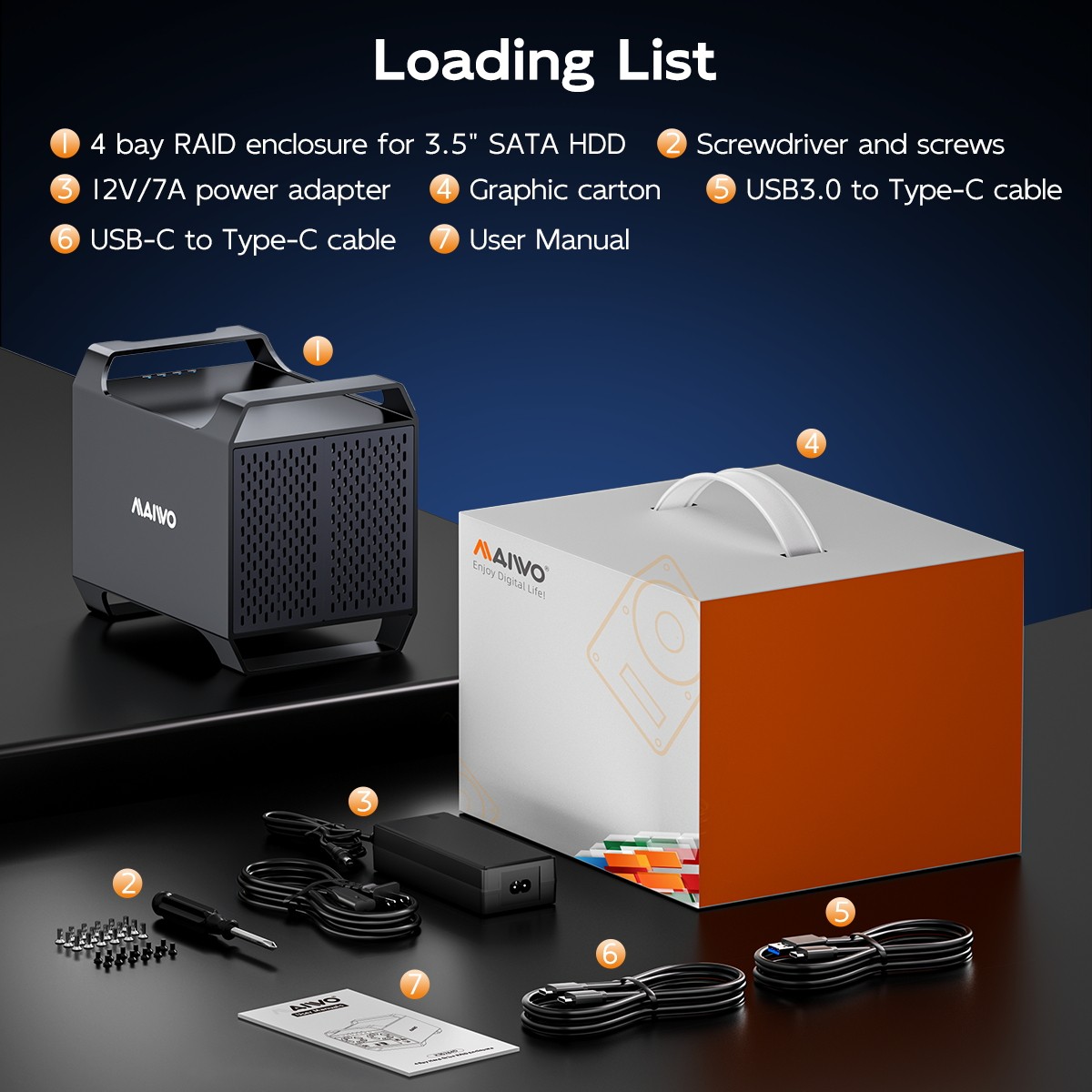 Brand: MAIWO Category: Disk Array Enclosure Compatible Size: 3.5-inch Color: Dark Gray Model: K35284D Transmission Protocol: USB 3.1 Package Contents: - 4-Bay Hard Drive Array Enclosure ×1 - Screwdriver + Screws - 12V/7A Power Adapter ×1 - Product Packaging Box ×1 - USB 3.0 to Type-C Cable ×1 - Type-C to Type-C Cable ×1 - User Manual ×1 - Product Warranty Card ×1 |