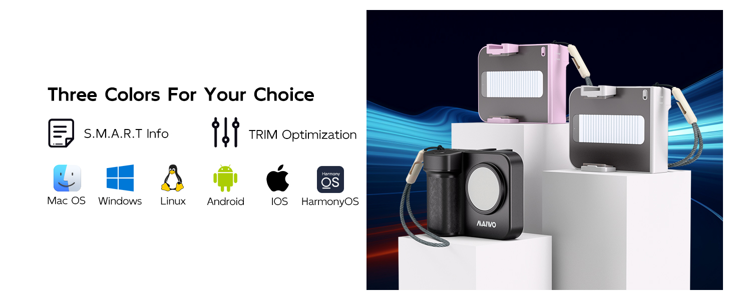 Brand: Maiwo Model: M2 Shell Material: Metal and ABS Additional Feature: 2TB capacity available Transfer Speed: 500-1000MB/s Interface: Type-C Warranty: 3 Years Storage Media: Flash Memory Available Capacities: 512GB, 1TB, 2TB Color Options: Twilight Black, Summer Cloud White, Sunset Glow Pink |