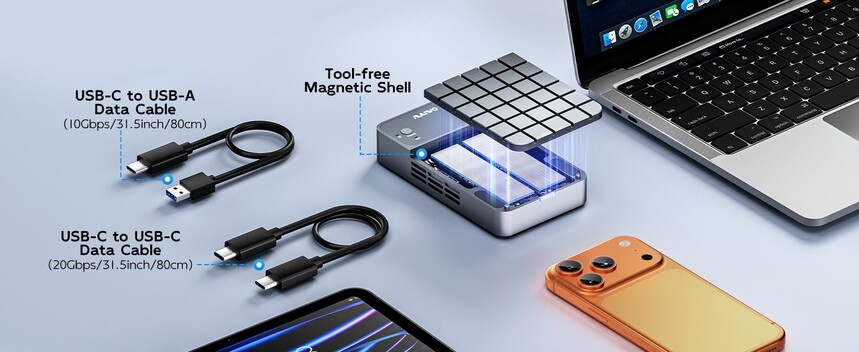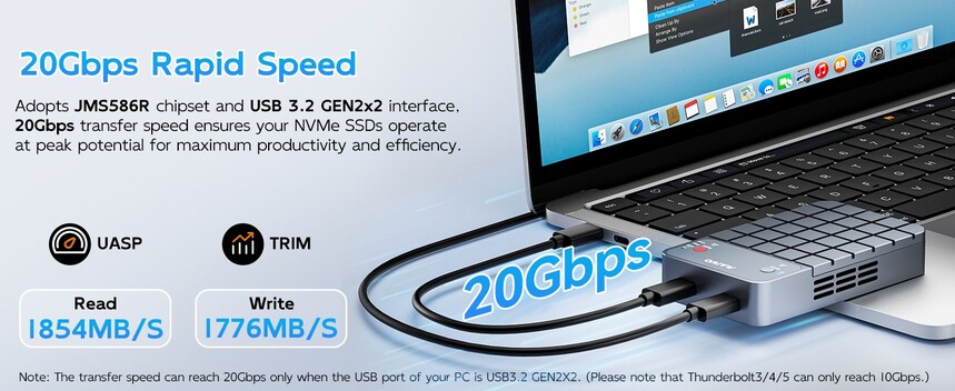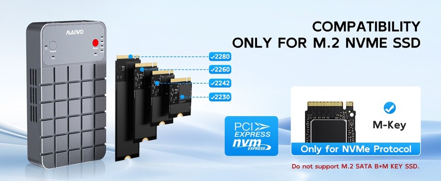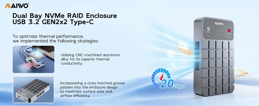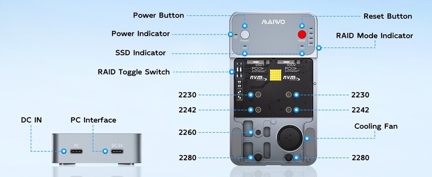 MAIWO K2.M.2 NVMe RAID Enclosure USB C 3.2 GEN2x2 20Gbps, Dual Bay PCIe NVMe Reader with Cooling Fan RAID 0/1/PM/JBOD for 2230/2242/2260/2280 M-Key SSD, C-C C-A Dual Cables, 5V 3A Power Adapter