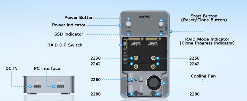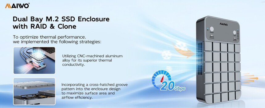 MAIWO K2042P3 Dual Bay RAID Enclosure for M.2 NVMe SATA SSD with Clone RAID 0 RAID 1, USB C 3.2 GEN2x2 20Gbps, M.2 SSD Cloner Duplicator with Cooling Fan, Dual Data Cables