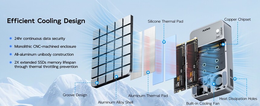 【Built-in Cooling Fan】This m.2 ssd duplicator features cooling fan, aluminum alloy shell, silicone and aluminum cooling pads for efficient heat dissipation. The design not only protects your SSD but also maintains optimal operating temperatures, ensuring stable performance even during extended use.