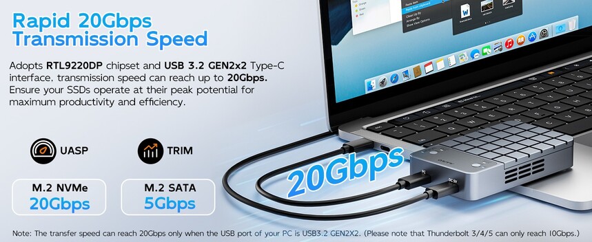 【20Gbps Transmission Speed】The m.2 ssd raid enclosure equipped with USB 3.2 GEN2x2 interface and JMS586R chipset, delivers exceptional data transfer speeds of up to 20Gbps and supports UASP and Trim. Ensure your m.2 ssd operate at their peak potential for maximum productivity and efficiency. Whether you're transferring large files or backing up critical data, this m.2 nvme/sata reader ensures lightning-fast performance, significantly reducing wait times and improving productivity.