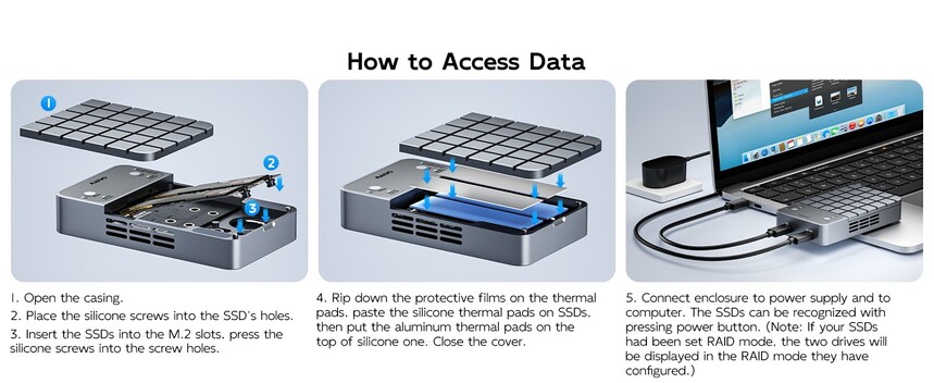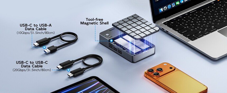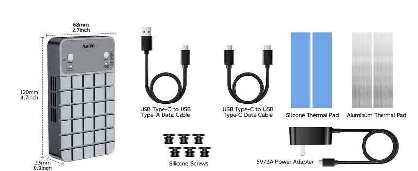 【Feature】5V 3A Power Adapter / Dual 31.5inch Data Cables: 20Gbps USB-C to USB-C & 10Gbps USB-C to USB-A / Silicone and Aluminum Thermal Pads / Max 16TB Capacit