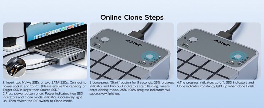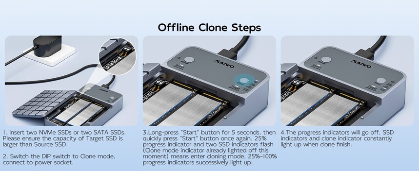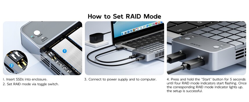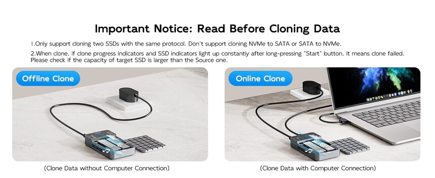 【Compatibility】This m.2 raid enclosure is specifically designed for M.2 NVMe M Key SSD and M.2 SATA B+M Key SSD, ensuring seamless compatibility with solid state drives in sizes 2230/2242/2260/2280mm. It is compatible with USB4/3.2/3.1/3.0/2.0. Work with Windows 7/8/10/11, macOS and Linux. Support UASP when operation system of computer is Windows 8.1 or above. 【Note: Only read or clone two SSDs with same protocol. If using with both NVMe and SATA SSDs, only recognize Source SSD.】
